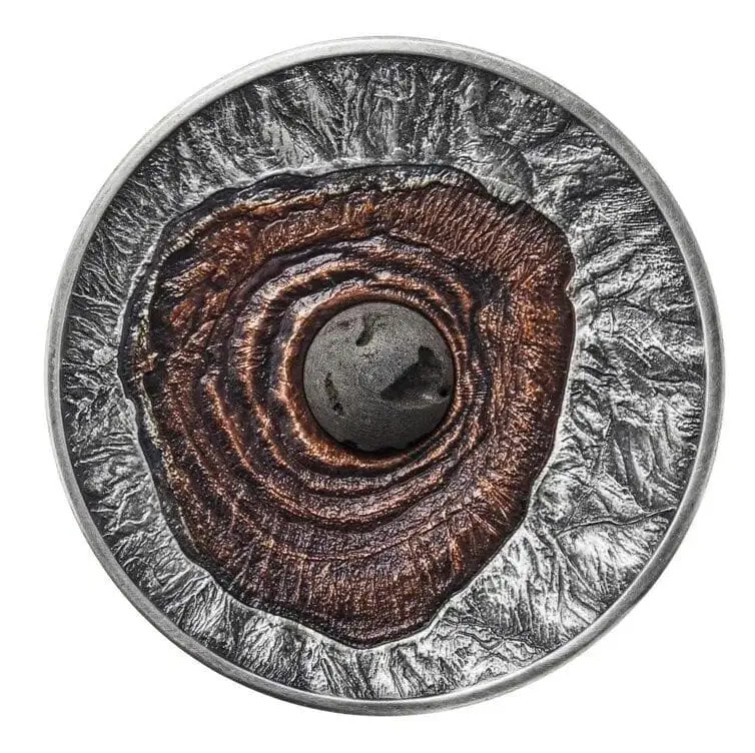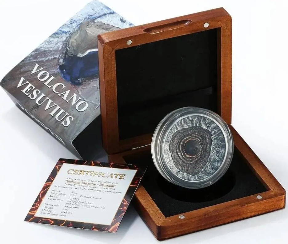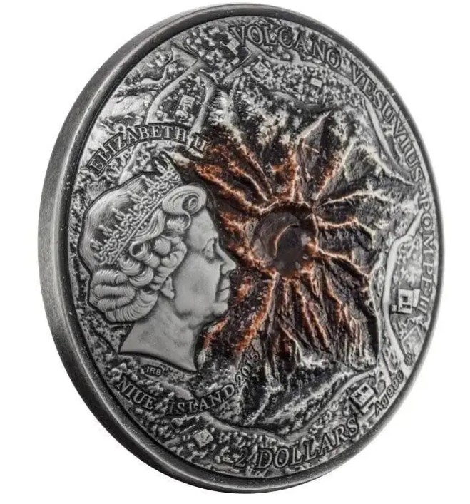 Struck from 2 oz of .999 fine silver, the coin features a highly innovative concave and convex profile, with an ultra high relief design rising an impressive 8 mm from the surface. Its antique finish enhances every intricate detail, capturing the raw power and historical significance of Vesuvius and the ancient city of Pompeii.
