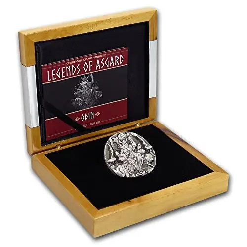 The reverse depicts Odin seated on his throne, flanked by his wolves, Freki and Geri, and his ravens, Huginn and Muninn, symbolizing wisdom, power, and vigilance. The obverse features a portrait of Queen Elizabeth II, representing Tokelau legal tender. Housed in a beautiful wooden display case, this coin is a must-have for collectors, silver investors, and enthusiasts of Norse legend, combining artistry, mythology, and bullion value in a remarkable collectible.
