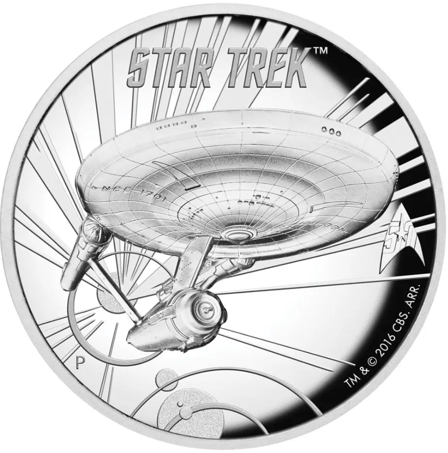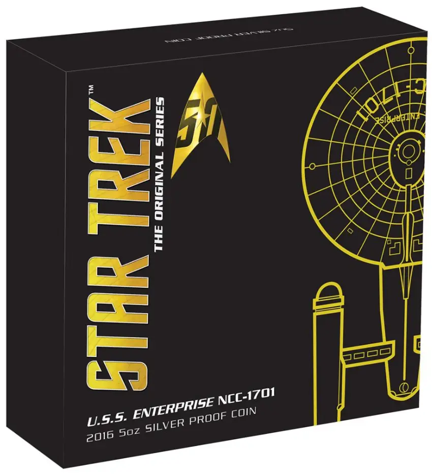 Struck from 5 troy ounces of .999 fine silver, the coin features a stunning high relief proof finish that highlights the intricate design of the famous U.S.S. Enterprise NCC-1701 as it travels through space. Above the starship appears the STAR TREK™ inscription, along with the official Star Trek 50th anniversary logo, celebrating five decades of the beloved franchise.