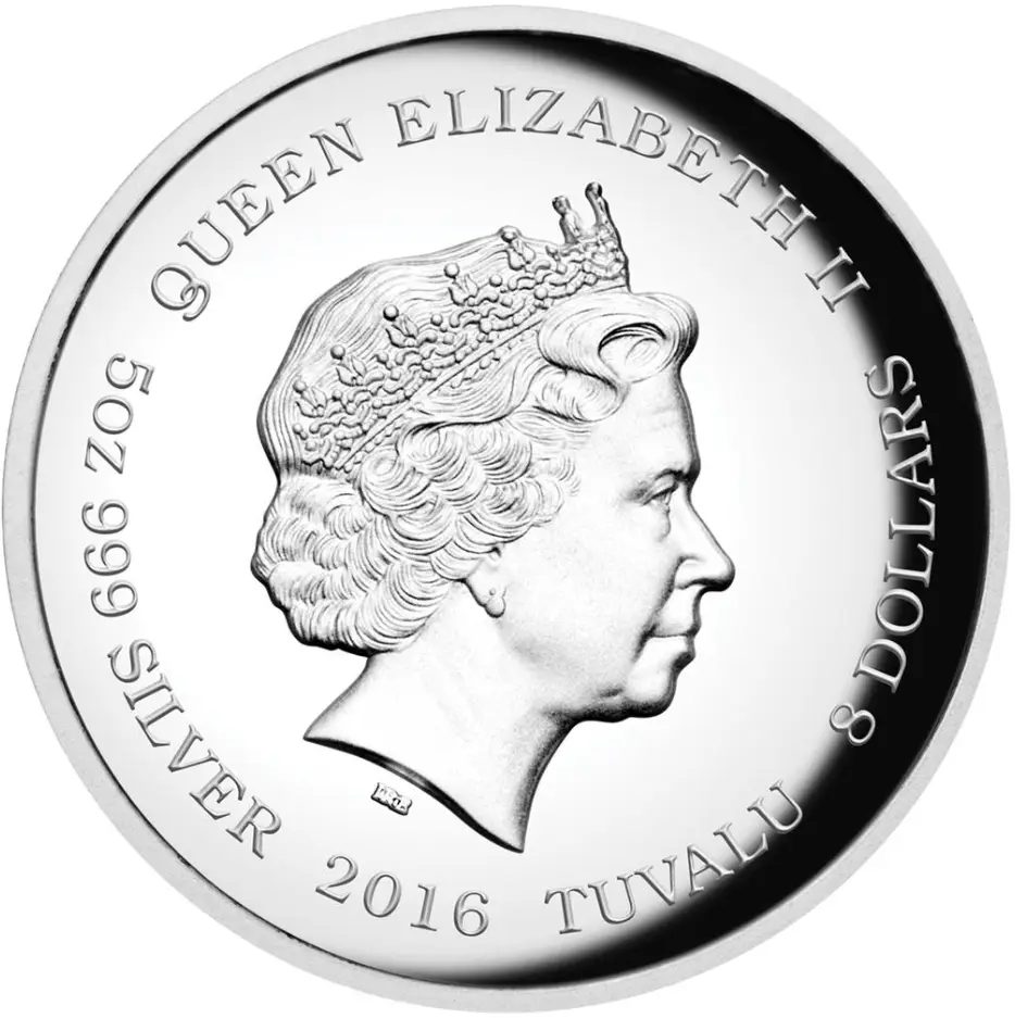 The obverse displays the Ian Rank-Broadley effigy of Queen Elizabeth II, along with the coin’s specifications and $8 Tuvalu legal tender denomination. With a diameter of over 50 mm, the large format allows the detailed design to truly stand out, making it a striking display piece for collectors.
