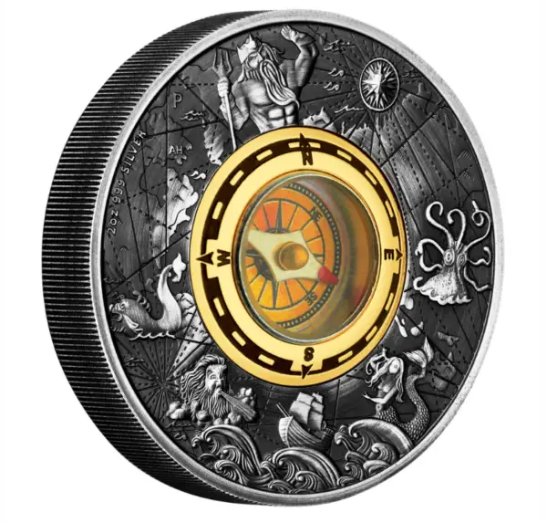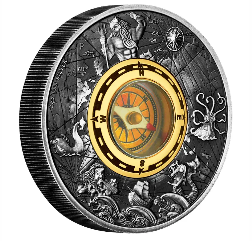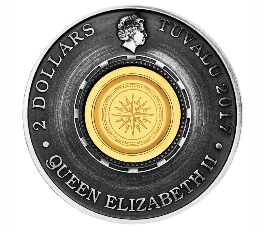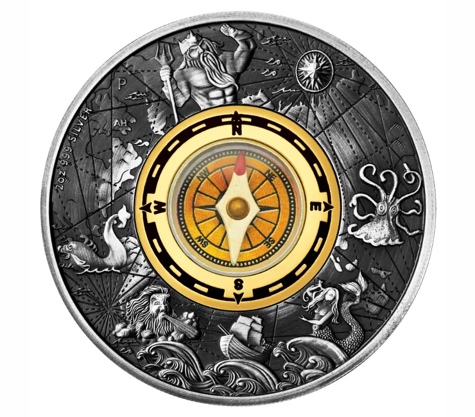 Explore the spirit of discovery with the 2017 Compass 2oz Silver Antiqued Proof Coin, an innovative and visually striking release that combines artistry, craftsmanship, and historical inspiration. Struck from two ounces of 99.9% pure silver, this remarkable coin features a functional-style compass set into its centre, surrounded by a beautifully detailed ancient world map design.