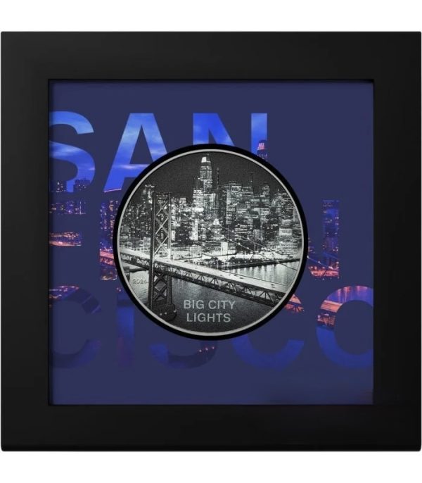 The 2024 CIT Big City Lights – San Francisco 1oz .999 Silver Proof Coin celebrates one of the world’s most iconic cities through CIT’s innovative minting and artistic design. This third release in the popular Big City Lights Series captures the brilliance of San Francisco at night, showcasing the city’s glowing skyline from an aerial vantage point above the famous Bay Bridge. Colourized highlights and polished proof surfaces create a dynamic contrast, giving the scene remarkable depth and atmosphere.