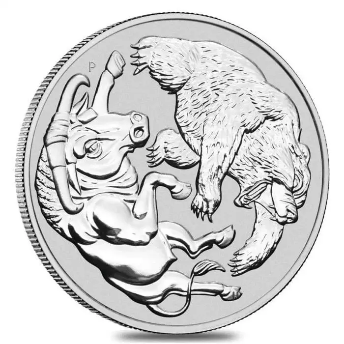 The reverse features a dramatic design by Ing Ing Jong, depicting a bull and bear locked in opposition—a visual representation of market movement. The charging bull symbolises rising markets, while the bear, known for its downward swipe, represents declining trends. The iconic ‘P’ mintmark is also included, confirming its origin.
