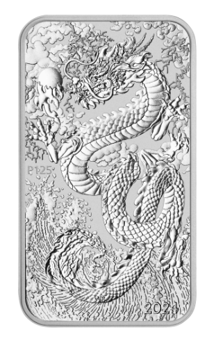 The reverse features a dramatic design of an oriental dragon pursuing a flaming pearl, representing wisdom and prosperity, surrounded by stylised waves and clouds — symbols of control over water and the heavens. The design also includes the inscription ‘2024’ and a special ‘P125’ mintmark marking The Perth Mint’s 125th anniversary.