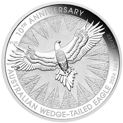 The reverse showcases a soaring wedge-tailed eagle set against a stylised sunburst background, accompanied by the inscriptions ‘AUSTRALIAN WEDGE-TAILED EAGLE’ and ‘10TH ANNIVERSARY’, along with the special ‘P125’ mintmark commemorating The Perth Mint’s 125th anniversary.