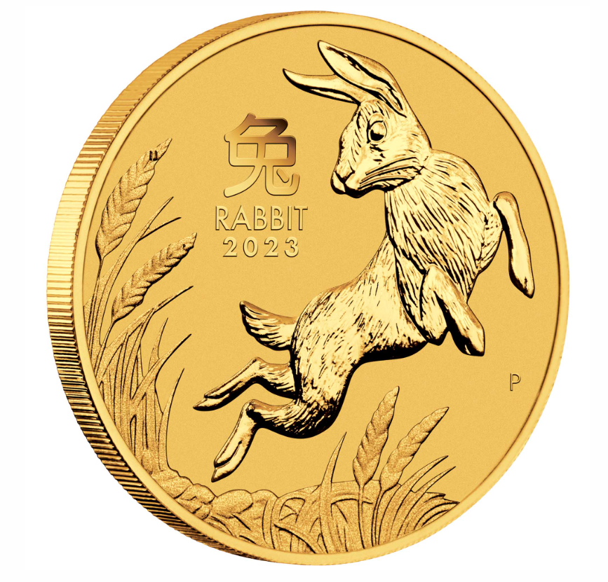 The reverse design features a leaping rabbit among grasses with feathery plumes, along with the Chinese character for “rabbit,” the inscription RABBIT 2023, and The Perth Mint’s “P” mintmark. The obverse portrays Jody Clark’s effigy of Her Majesty Queen Elizabeth II, together with the coin’s weight, purity, and denomination.