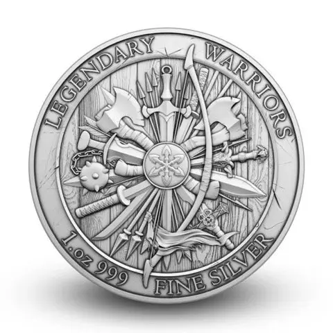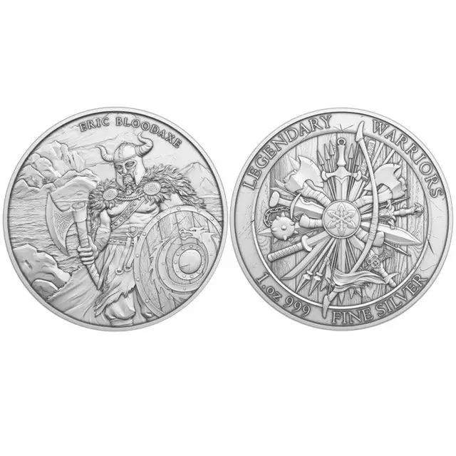 Step into Viking history with the Silvertowne Mint 1oz Legendary Warrior Eric Bloodaxe silver round, now available in a tube of 20. Each round honors the legendary warrior king, showcasing him in full battle stance with axe and shield, surrounded by detailed Viking weaponry motifs. Perfect for collectors, investors, or enthusiasts of Viking lore, this set combines historical significance with bullion value. The tube format ensures safe storage, easy stacking, and a complete set of these striking silver rounds.